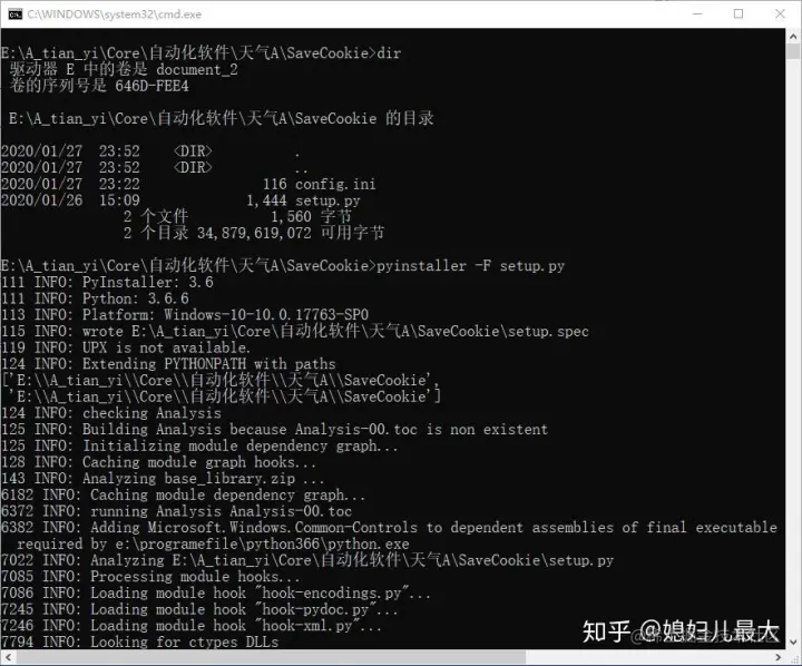 1、我们来将这个.py的文件打包成一个exe,我们直接cmd切换到这个脚本的目录,执行命令:pyinstaller-F setup.py,如下图所示。