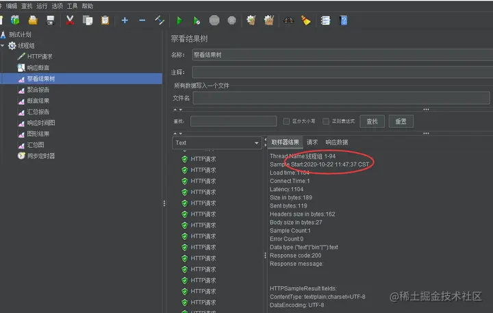 - jmeter这里的线程数,就是我们常说的虚拟用户数,即模拟N个人请求这个服务。这个不等同并发数,其实要验证也比较简单,在线程组中增加一个察看结果树可以看到这段时间里的http请求的时间不是在同一秒或者说同一单位时间(时刻)。