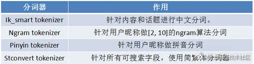 ● 因为用户昵称和内容、话题表达的含义不同,针对不同字段可以采取不同的分词器,以便于提升匹配精准度。具体作用见下表所示: