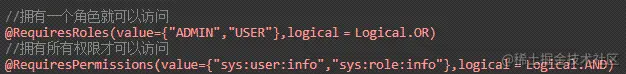 @RequiresRoles(value={"ADMIN","USER"},logical = Logical.OR)