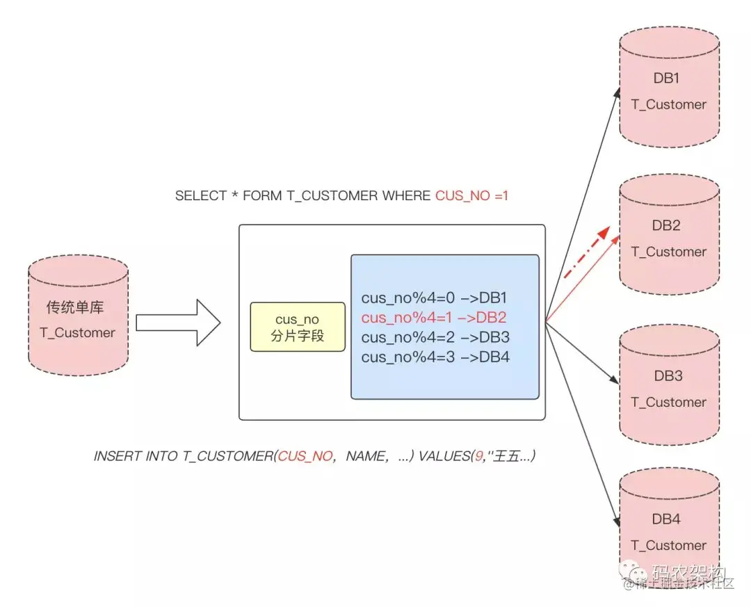 一般采用hash取模mod的切分方式,例如:将 Customer 表根据 cusno 字段切分到4个库中,余数为0的放到第一个库,余数为1的放到第二个库,以此类推。这样同一个用户的数据会分散到同一个库中,如果查询条件带有cusno字段,则可明确定位到相应库去查询。