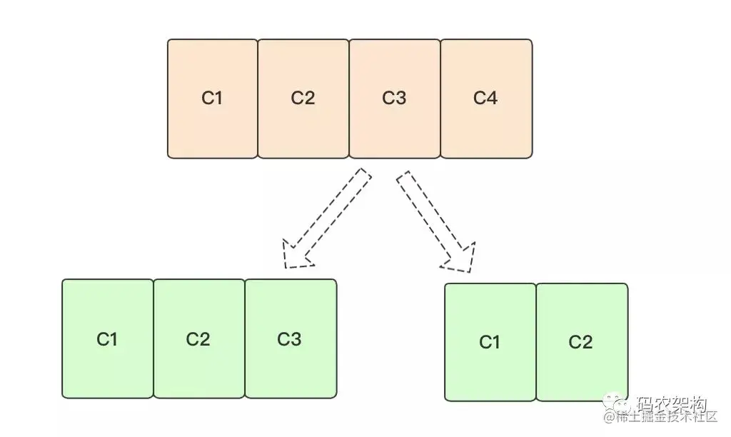 1.2 垂直分表 是基于数据库中的"列"进行,某个表字段较多,可以新建一张扩展表,将不经常用或字段长度较大的字段拆分出去到扩展表中。在字段很多的情况下(例如一个大表有100多个字段),通过"大表拆小表",更便于开发与维护,也能避免跨页问题,MySQL底层是通过数据页存储的,一条记录占用空间过大会导致跨页,造成额外的性能开销。另外数据库以行为单位将数据加载到内存中,这样表中字段长度较短且访问频率较高,内存能加载更多的数据,命中率更高,减少了磁盘IO,从而提升了数据库性能。