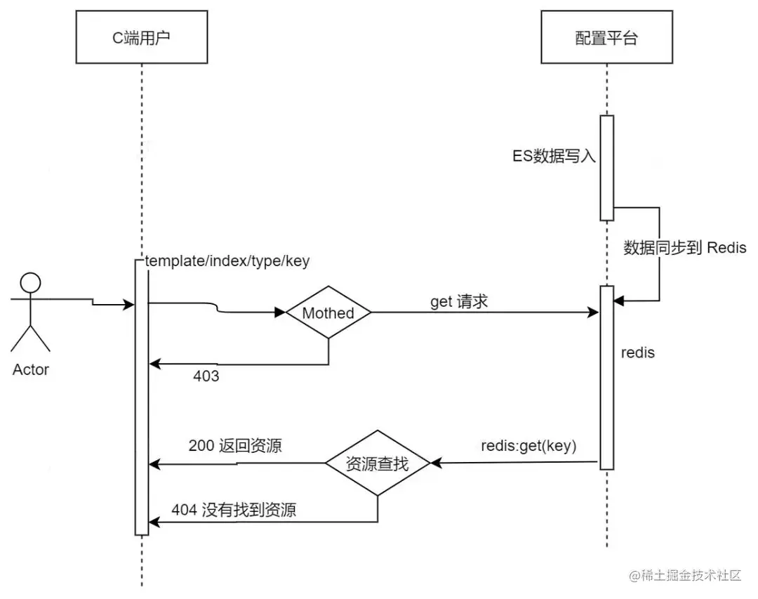 此前,我们通过配置化平台后台配置一些相关活动相关的数据,并存放在 ES 服务以及Redis 中。在用户端时,当有用户访问到我们生成好的活动页面时,首先在 Nginx 中通过 content_by_lua_file 配置使用 Lua 对于活动配置相关的请求处理,对于非 GET 方式的请求将会直接返回 403,否则会在 Redis 中去查询相关的数据并返回到用户端。