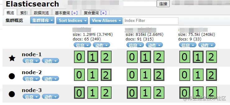 对于 ES 具体的数据我们可以通过 elasticsearch-head 插件来查看索引、类型、分片、文档等信息,如下图所示: