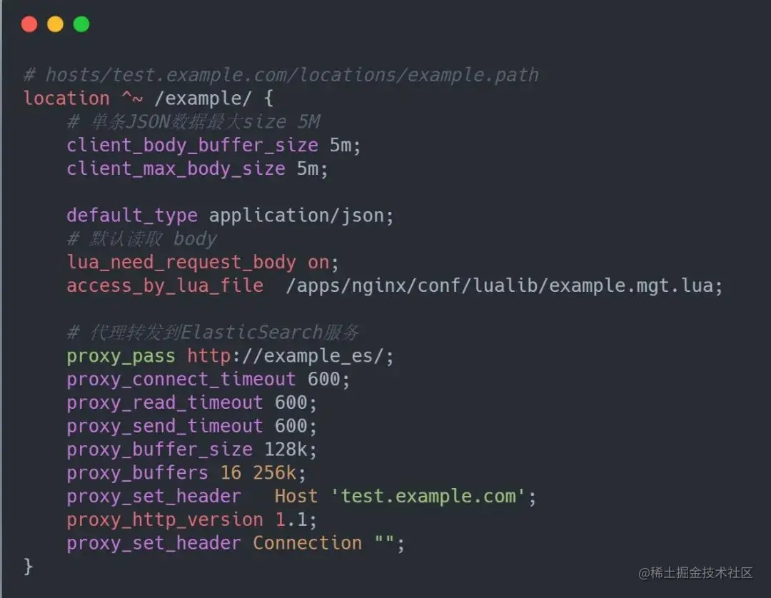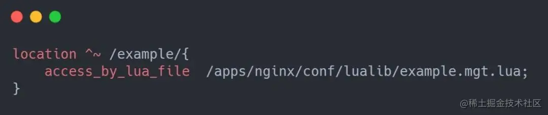 接下来看一下具体实现。首先,在 location 引入 lua 相关的配置,通过 access_by_lua_file 来嵌入 lua 相关处理。