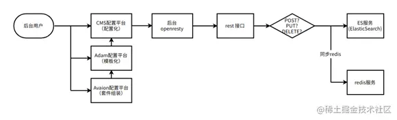 后台配置相关流程中涉及 Openresty、Nginx、Lua 脚本、ElasticSearch、Redis 等。