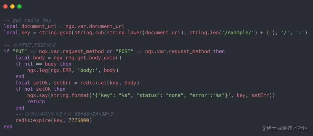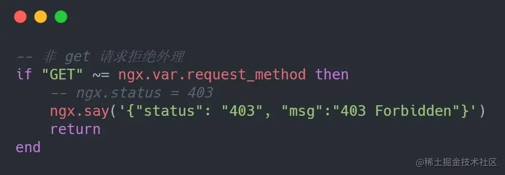 单条 JSON 限制以及请求方式的拦截都可以在配置当中清晰地了解到,再看一下 Lua 到底做了些什么?