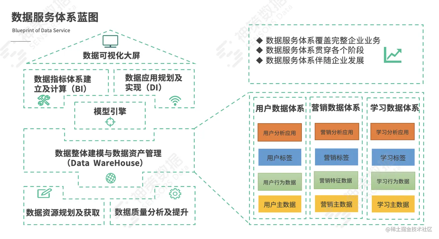 从业务视角来看,数据服务体系需要覆盖完整的公司业务、贯穿业务的各个阶段并伴随企业发展。 在此数据服务体系中,处于核心环节的是数据整体建模和数据资产管理,也就是大家熟悉的统一化数仓建设。结合在线教育业务特点,作者认为数仓建设需要满足三个核心数据体系: