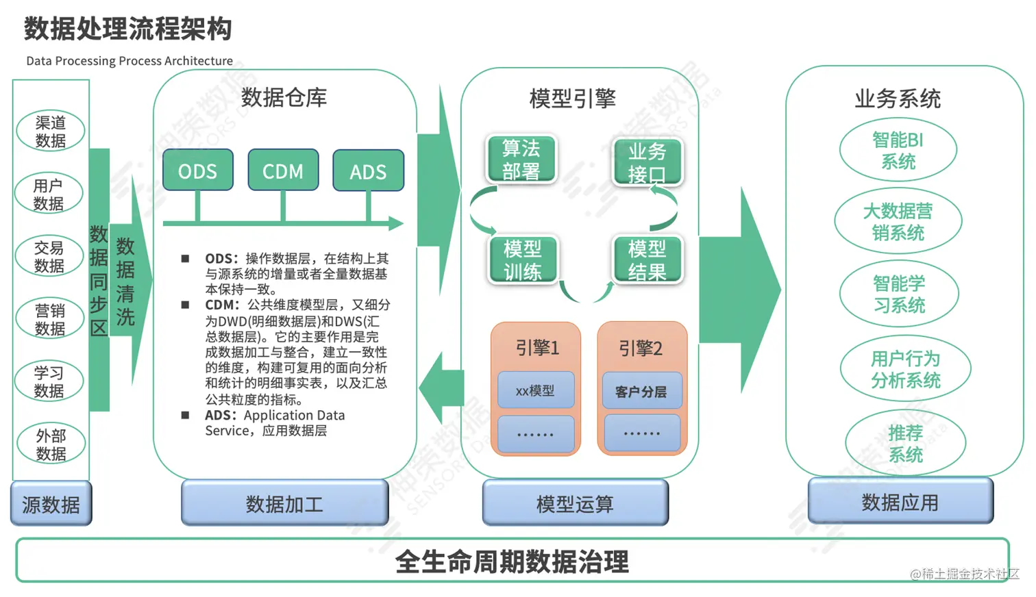 数据处理流程主要包括源数据同步清洗、数据处理加工、模型运算和数据应用。基于在线教育公司的业务特点,作者总结出源数据主要包括:渠道数据、用户数据、交易数据、营销过程数据、学习数据、外部第三方数据等。