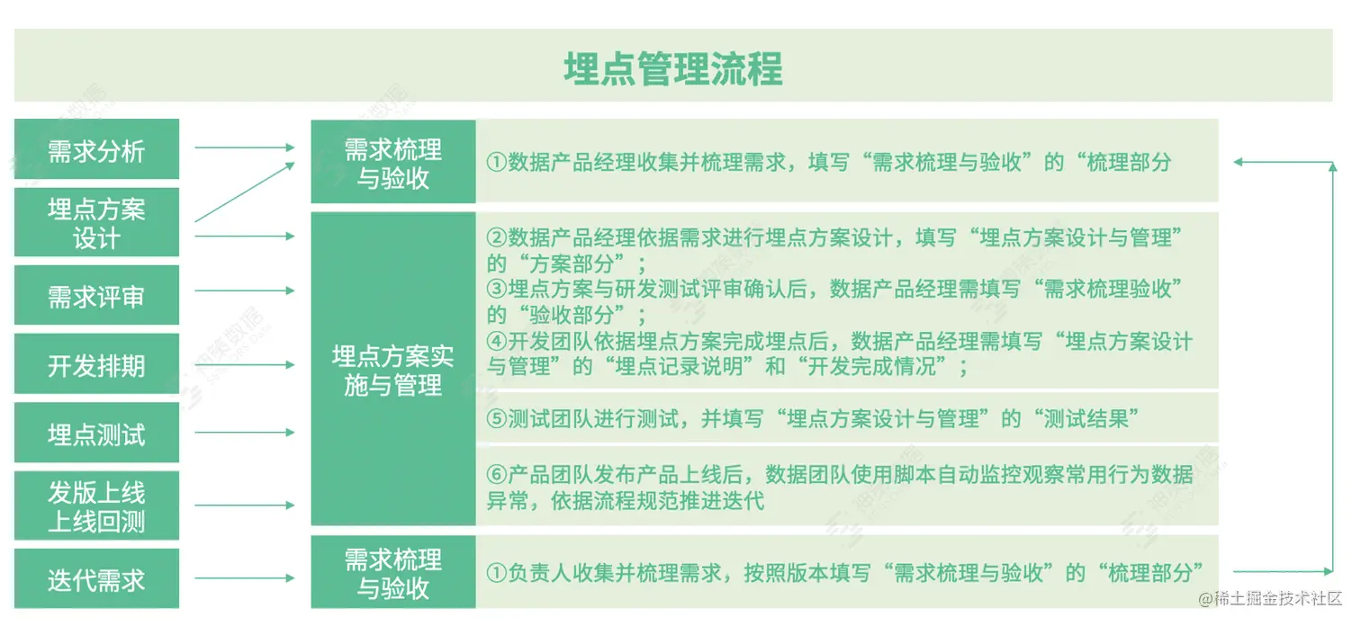 埋点管理流程主要环节有:需求分析、埋点方案设计、需求评审、开发排期、埋点测试、上线回归、需求迭代闭环等环节,每个环节具体需要做什么,参见下方埋点管理流程图: (2)需求梳理与验收