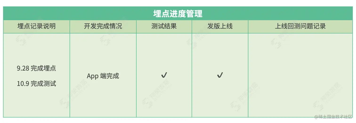 埋点进度管理文档是埋点开发里程碑节点 Check 工具,文档格式见下图。 (4)开发流程优化迭代