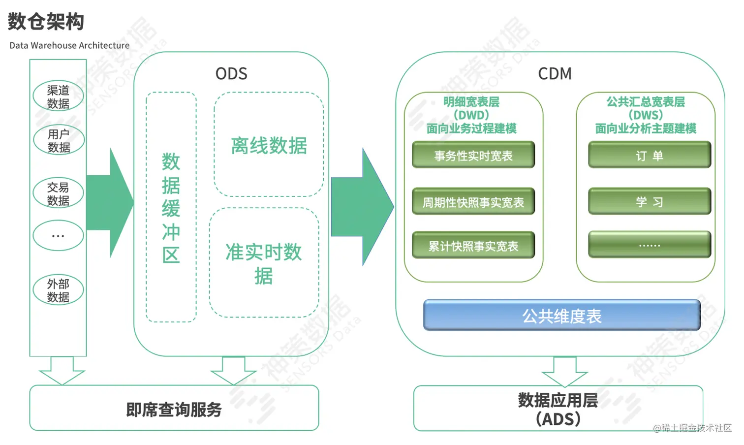 数据仓库的层次划分采用业界通用的层级划分方式,包括:ODS、DWD、DWS、ADS 层,如下图所示: (3)数据处理流程架构
