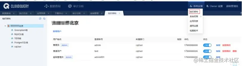 权限管理应该是CloudQuery的一大亮点了,是基于RBAC的权限模型设计,如果对于权限的管理无法实现细粒度多维度的管理,等推广到业务侧再进行管理是比较困难的。这里可以根据组织架构进行管理,可以分配不同的部门和小组进行管理,在其中配置相应的用户。