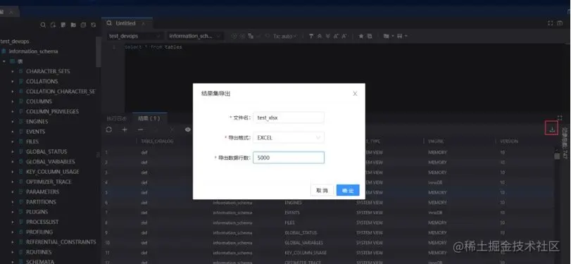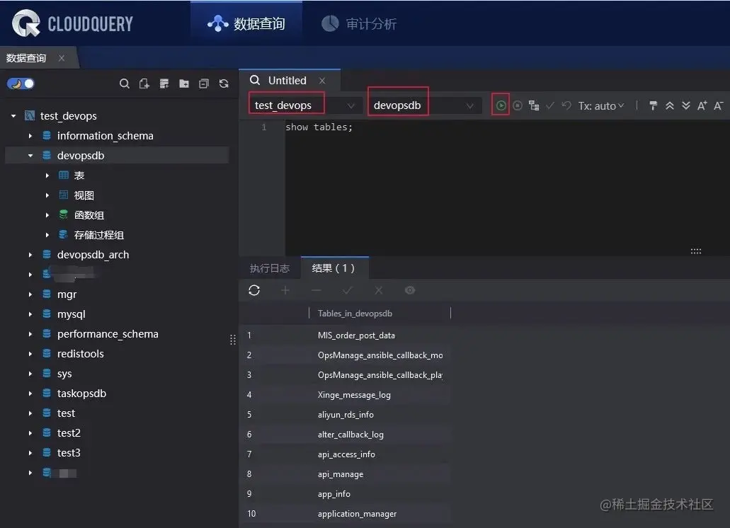 在数据查询区域可以选择对应的连接别名和对应的数据库,这样就可以根据使用场景灵活的切换数据库了,这个设计点还是不错的,在这个设计点上,比workbench要快捷一些。