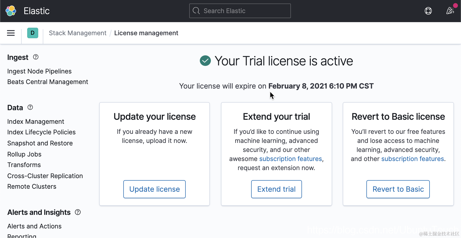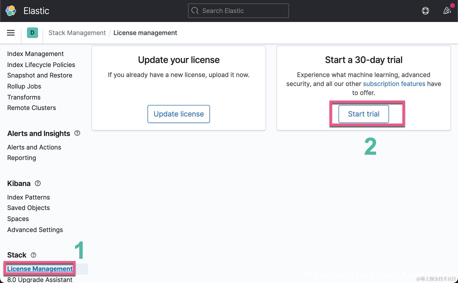 机器学习需要我们启动白金功能。如果你想了解更多关于订阅的服务,请阅读链接www.elastic.co/cn/subscrip…。我们在安装的 Elastic Stack 中启动30天试用: