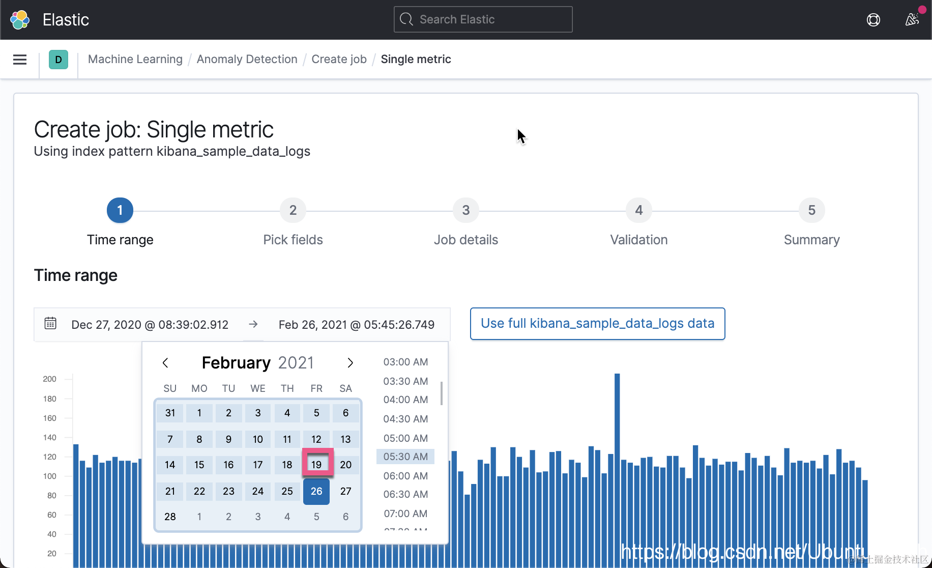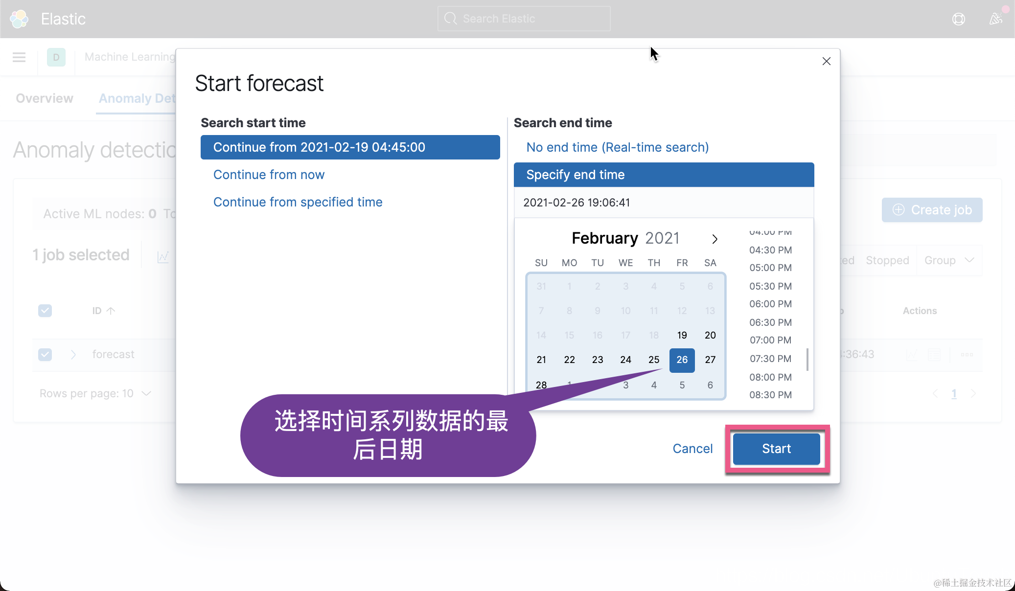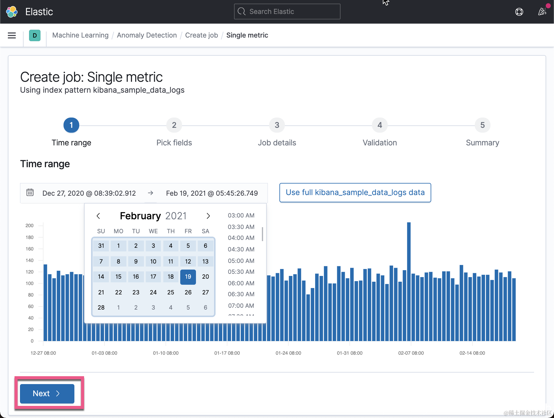 在上面我们先选择 Use full kibana_sample_data_logs data 按钮,然后选择机器学习的终止时间来进行调整时间。我们留下最后7天的数据不用作机器学习的数据: