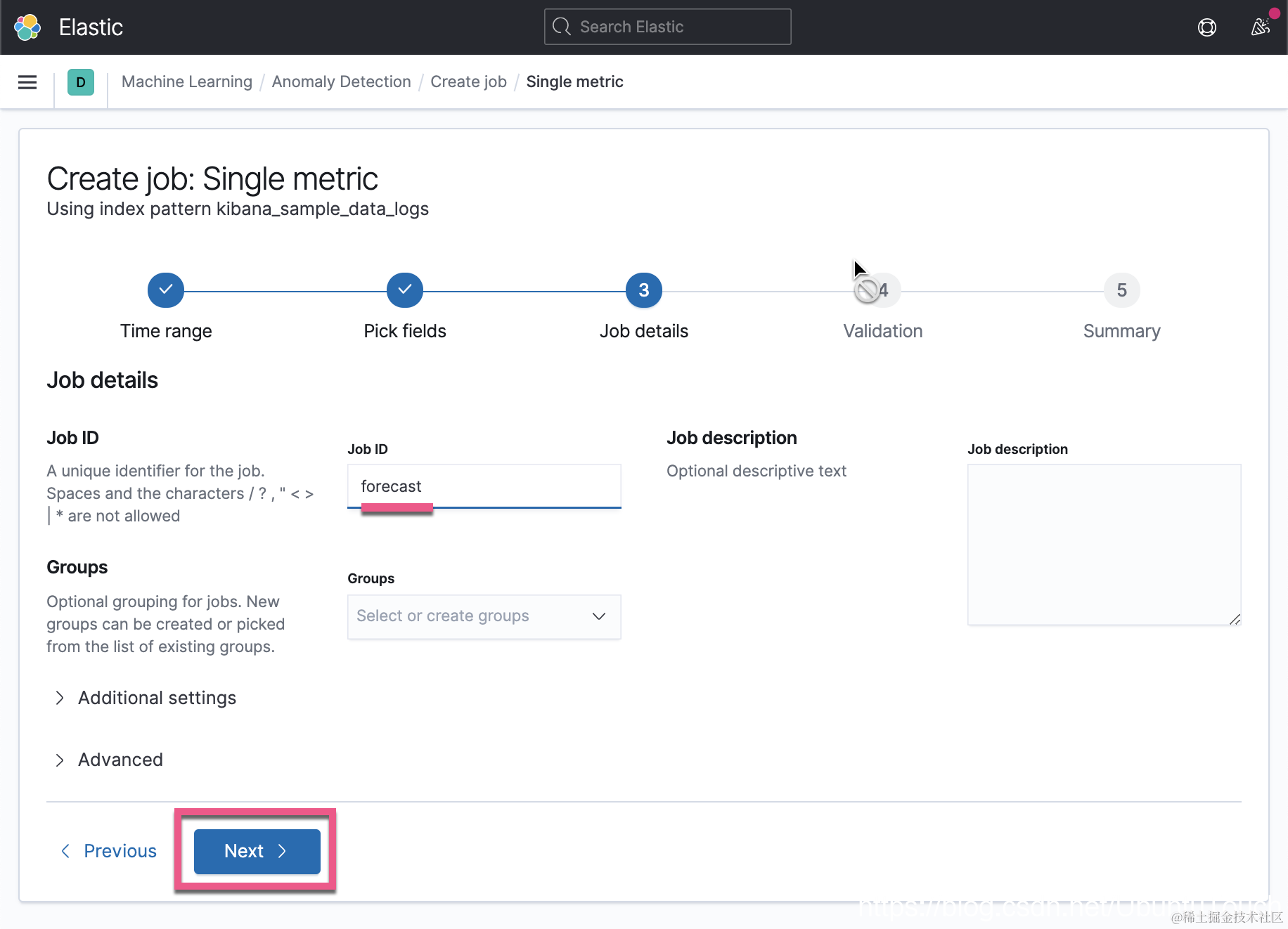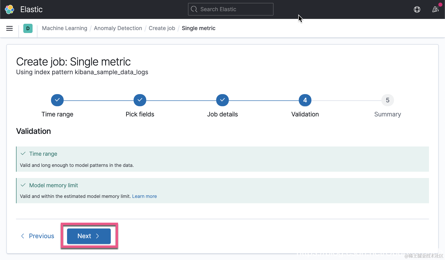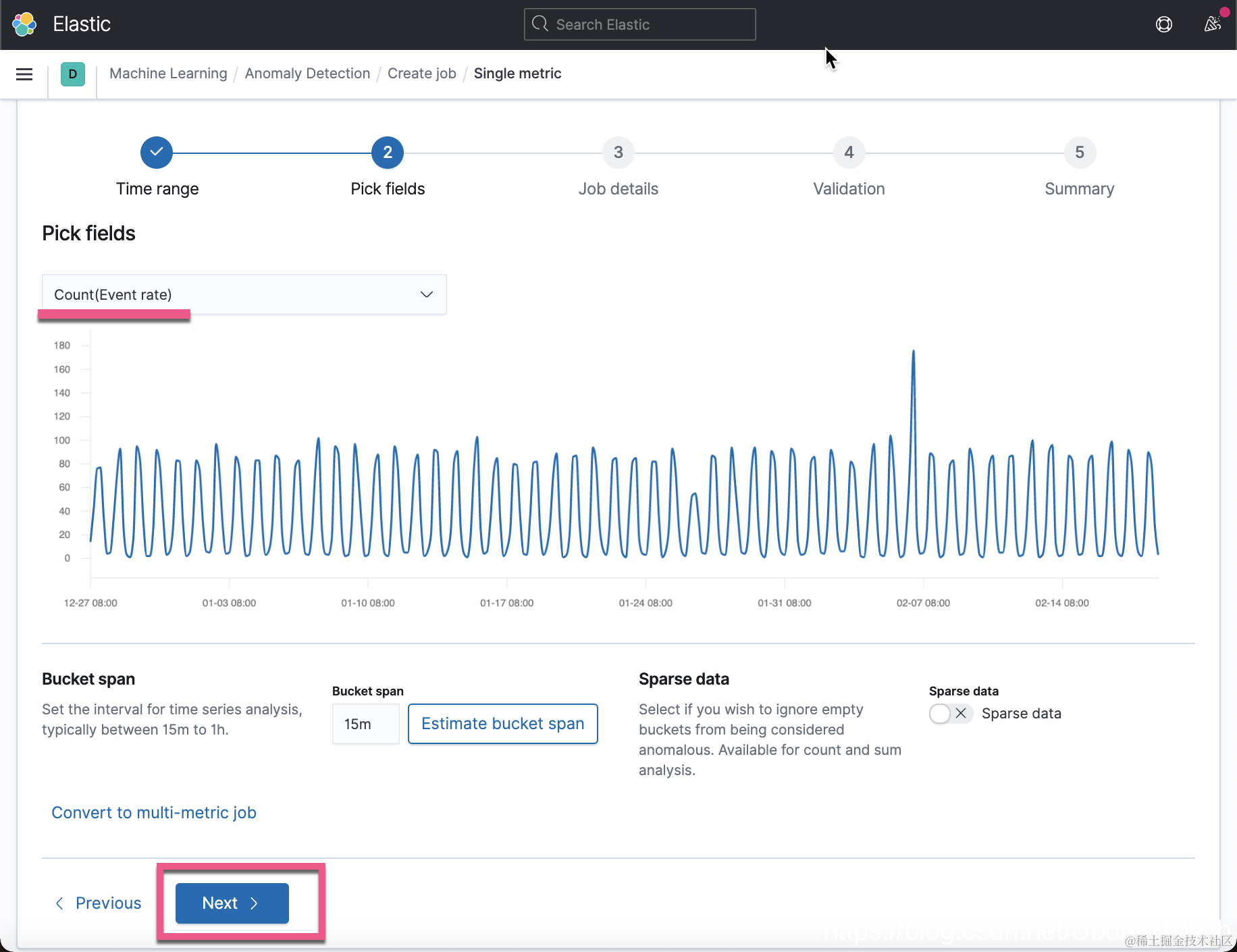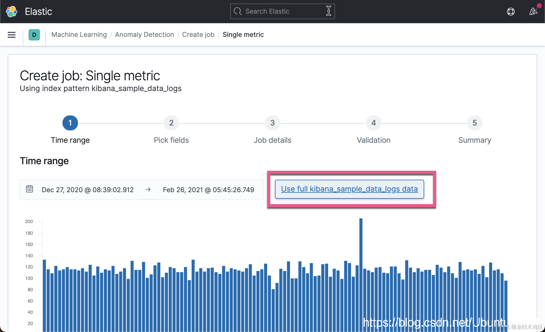 在上面我们先选择 Use full kibana_sample_data_logs data 按钮,然后选择机器学习的终止时间来进行调整时间。我们留下最后7天的数据不用作机器学习的数据: