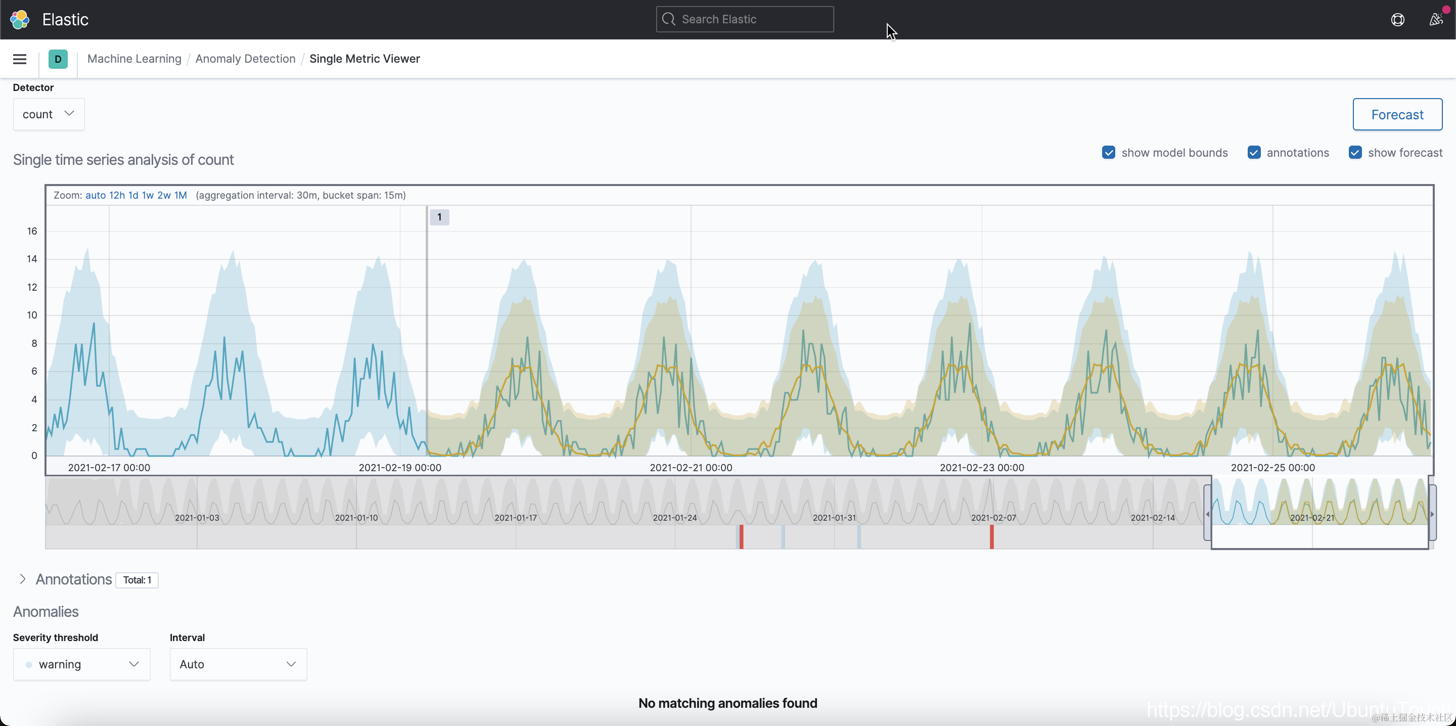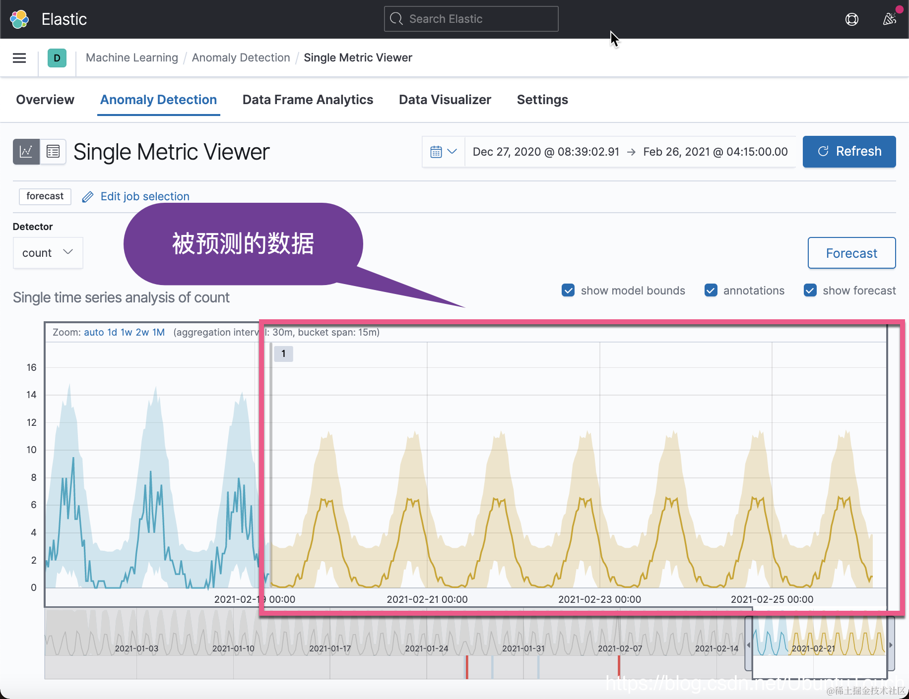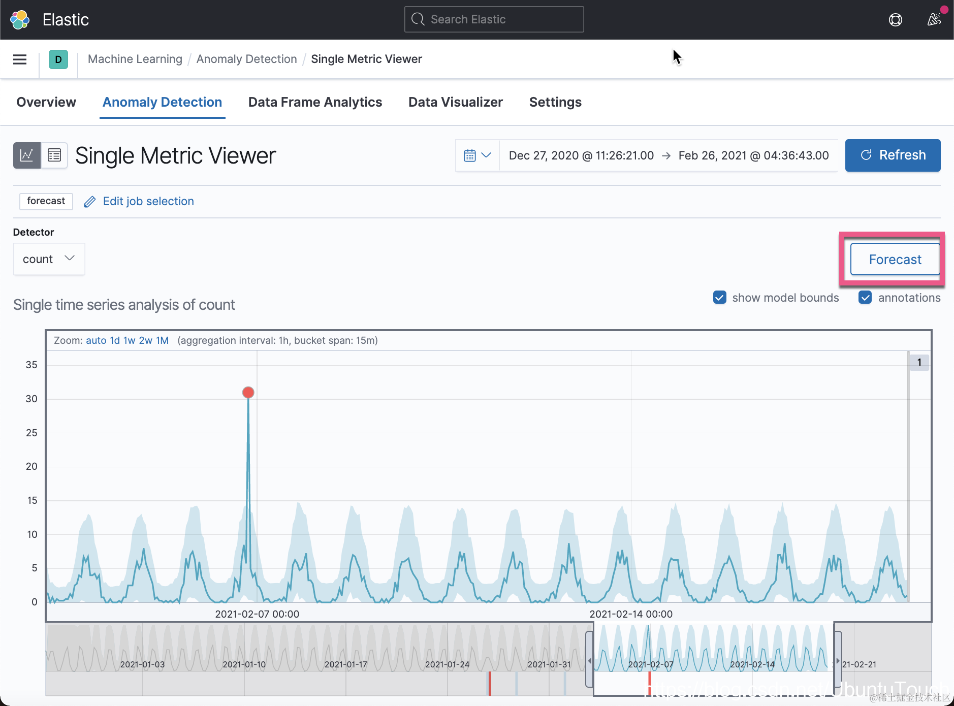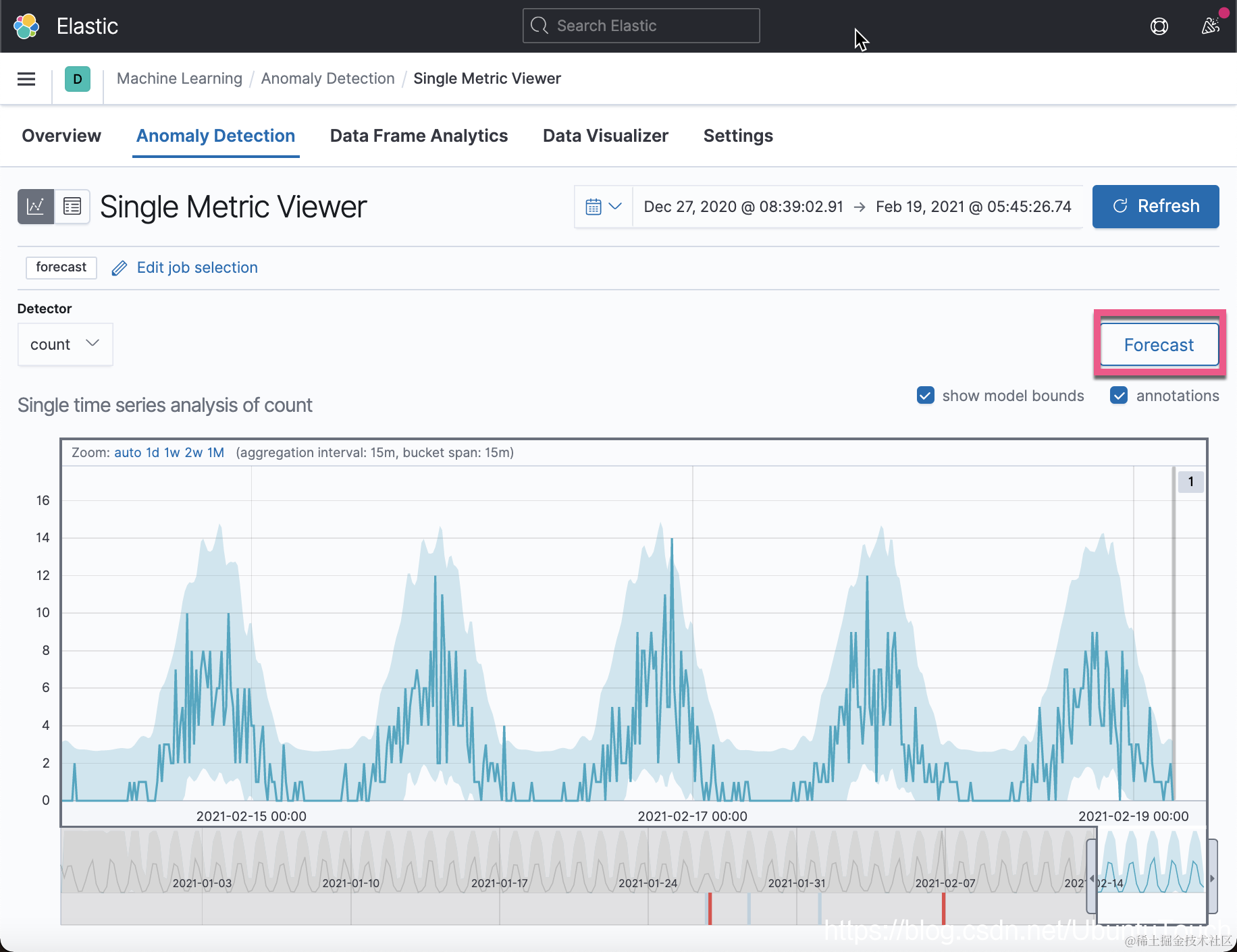 上面显示 datafeed-forecast 已经被成功启动。点击上面的 Single Metric Viewer: