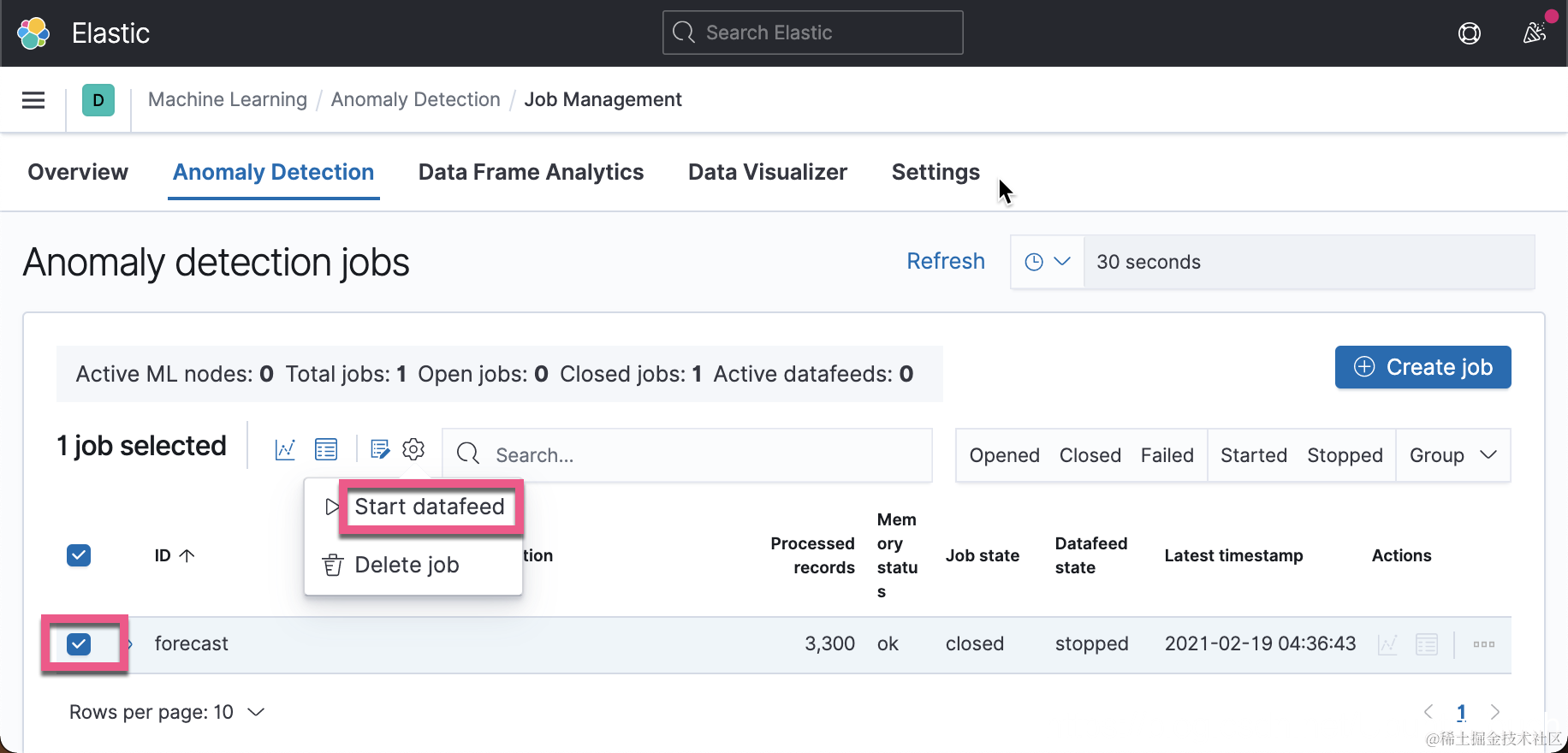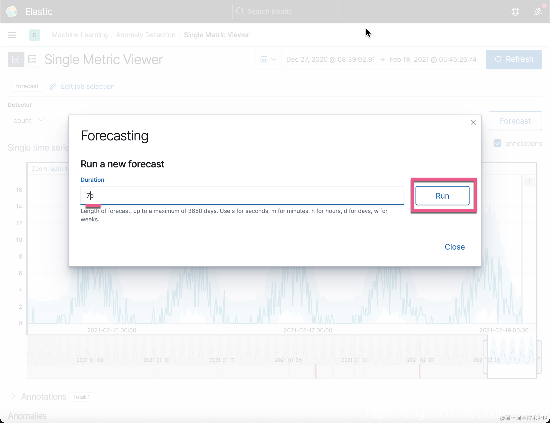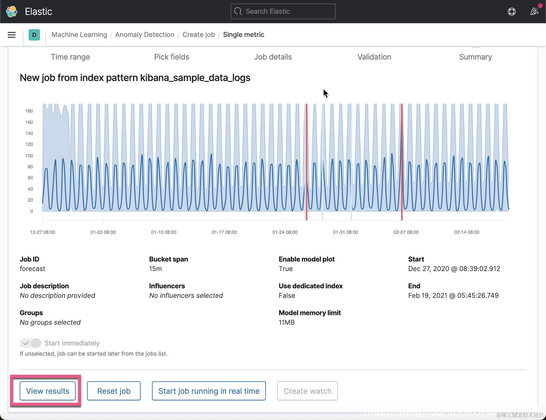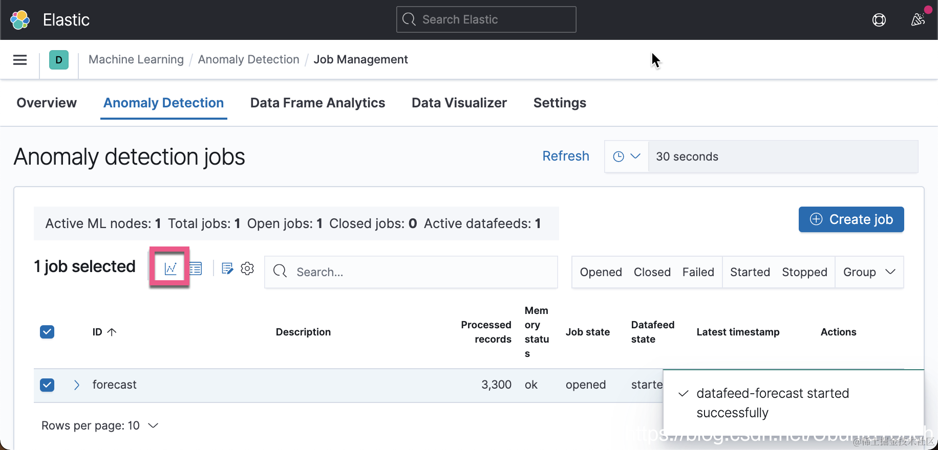 上面显示 datafeed-forecast 已经被成功启动。点击上面的 Single Metric Viewer: