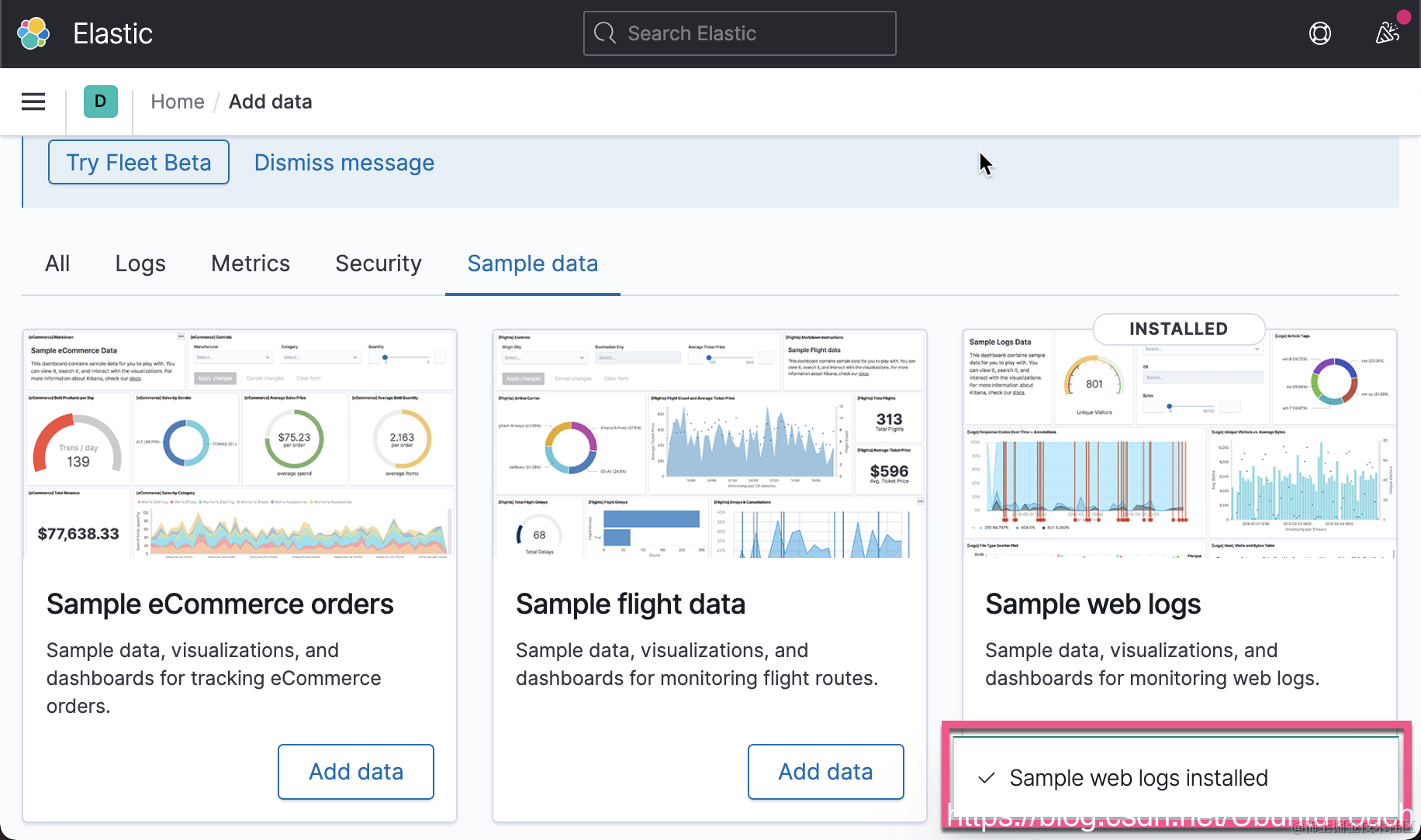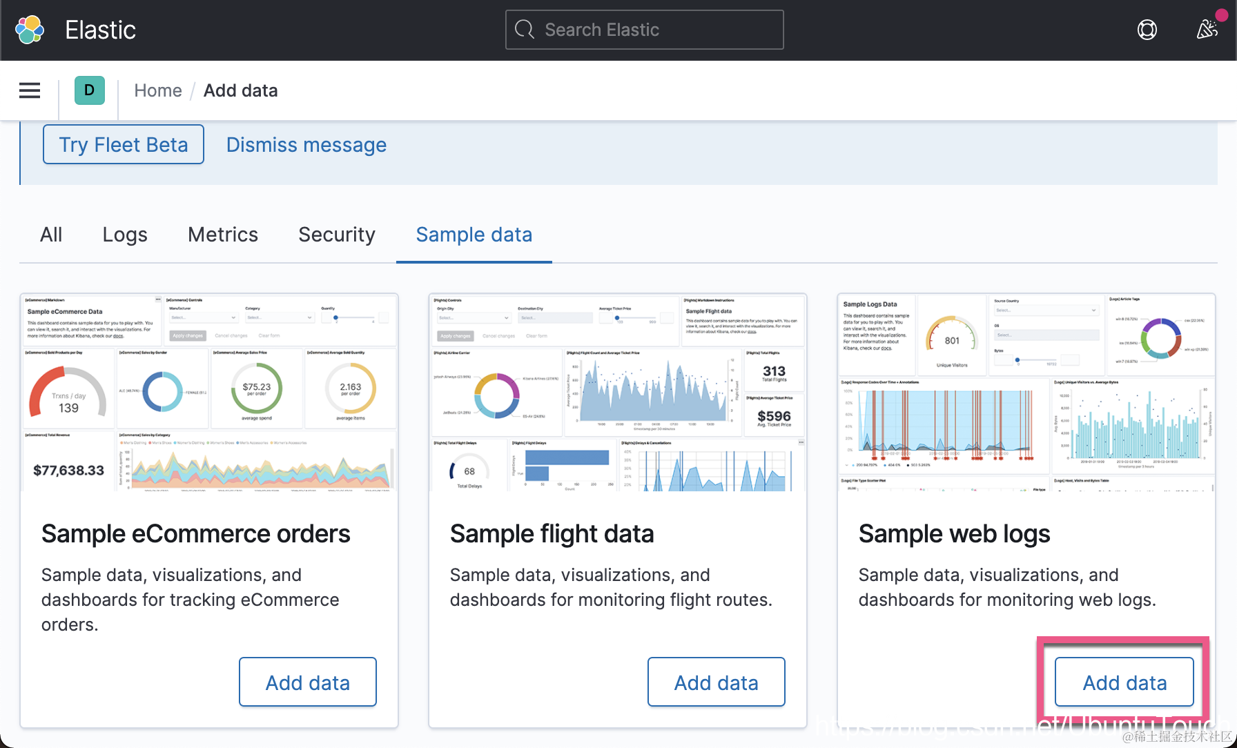 这样在 Elasticsearch 中,我们就会发现一个叫做 kibana_sample_data_logs 的索引: