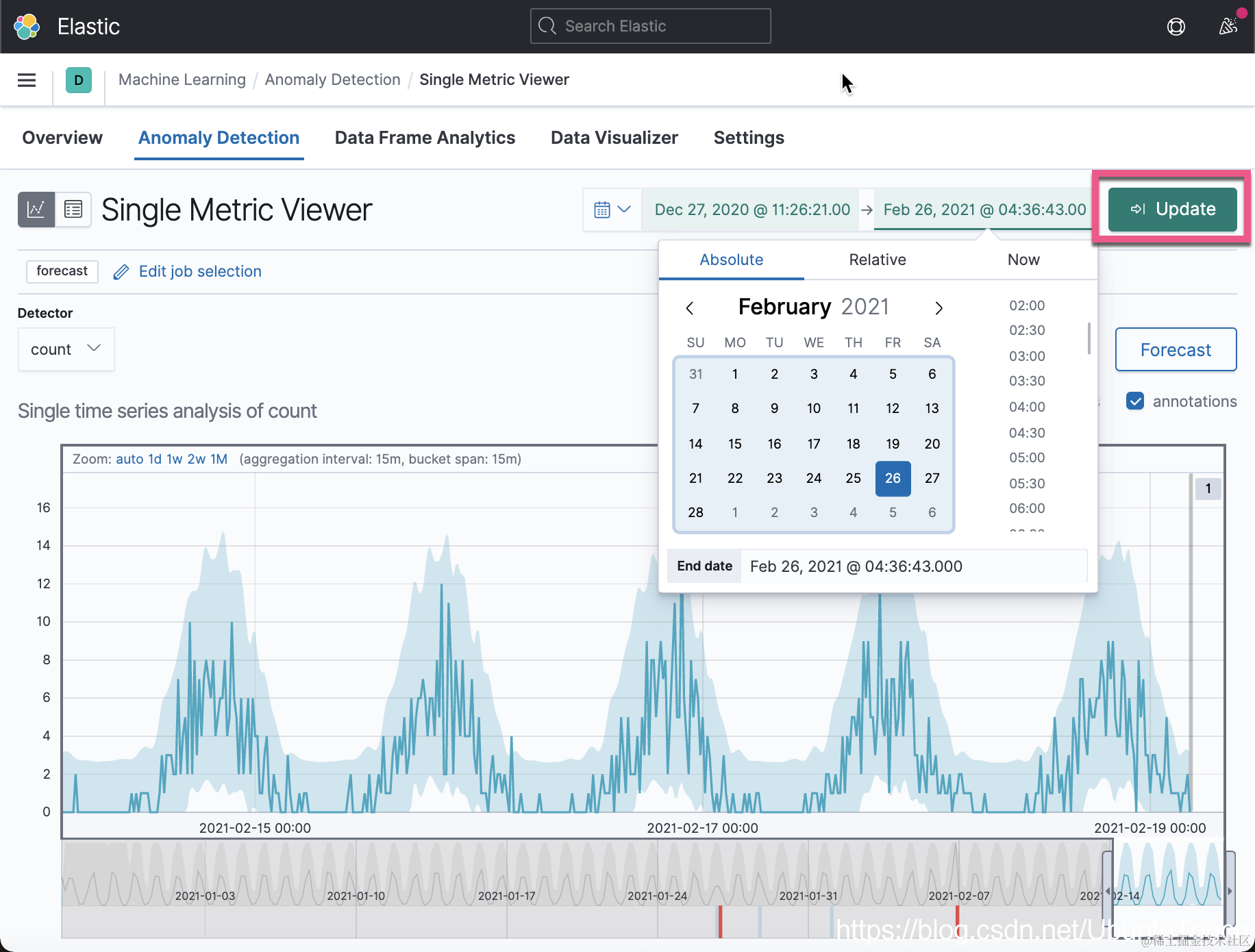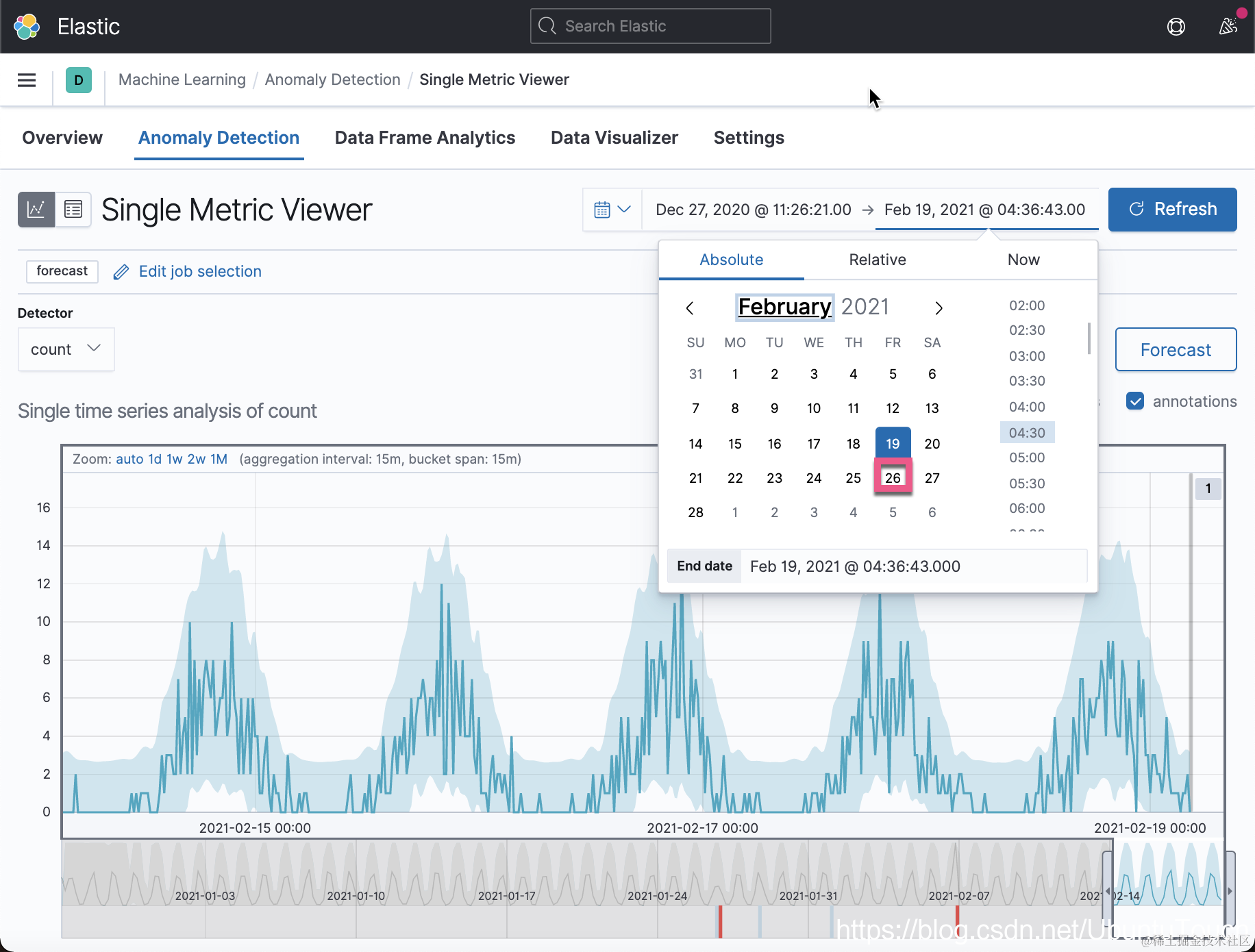在上面显示时间系列的最终时间是2021年2月26日。我们选择19日作为机器学习的终止时间。这样我们就可以留下7天的时间作为我们将来可以进行预测的时间范围,并和真实的数据来进行比较。在上面,我选择2月19日。