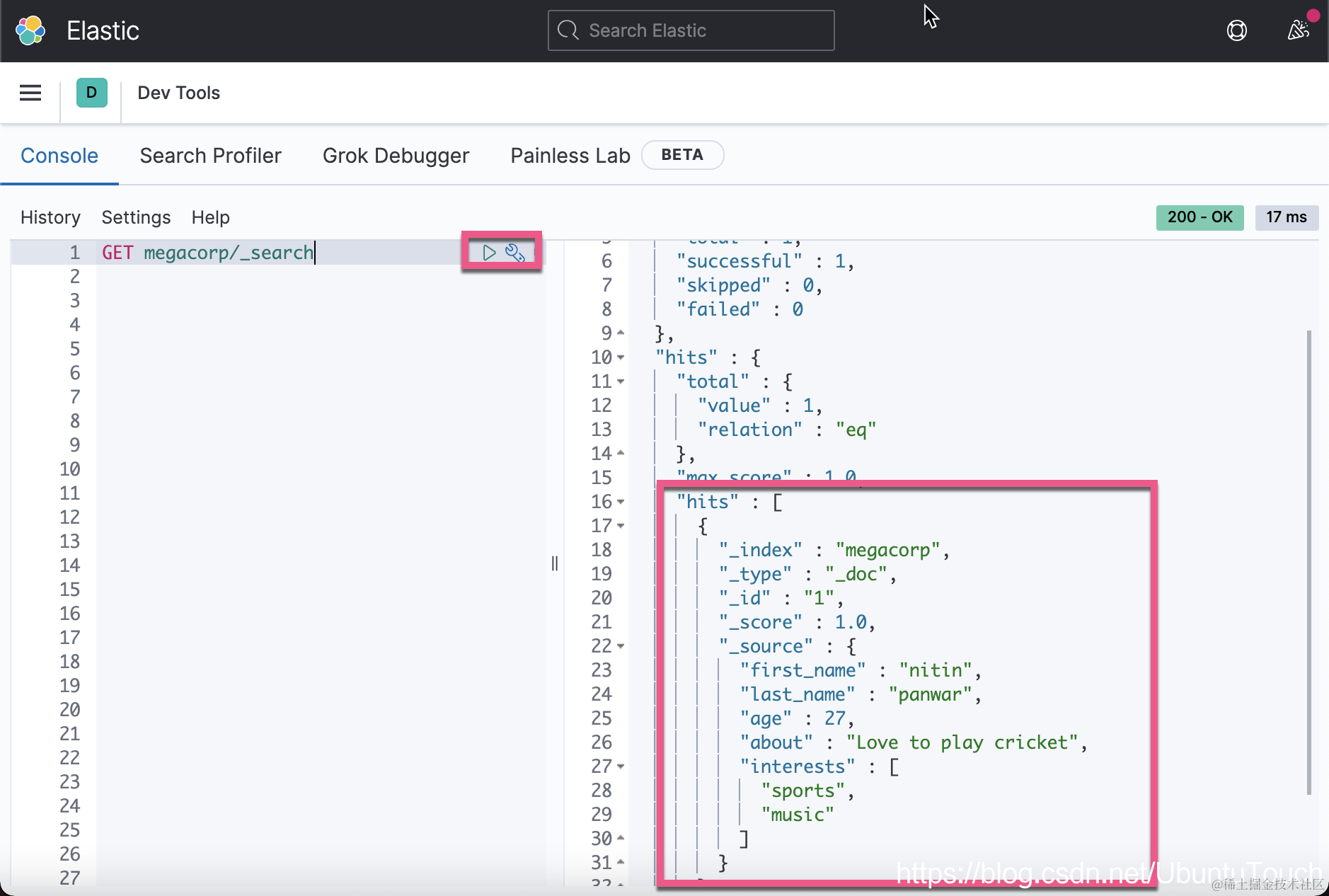 它搜索所有的文档。在这里,我们使用 match_all 搜索。运行上面的代码显示: