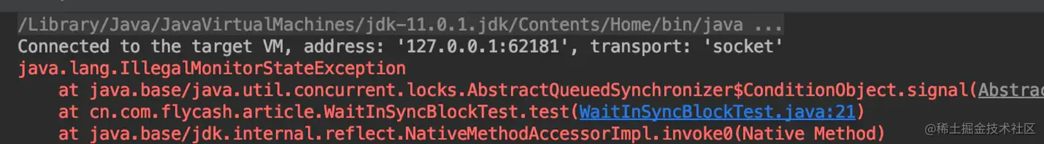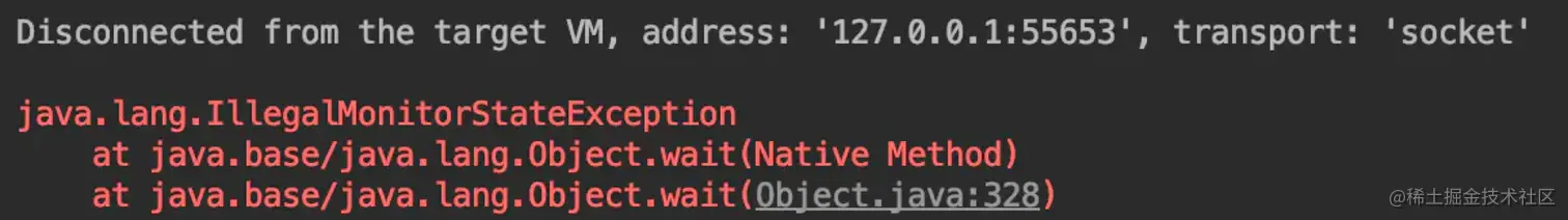 我仔细回顾一下,如果wait()方法不在同步块中,代码的确会抛出IllegalMonitorStateExeception: