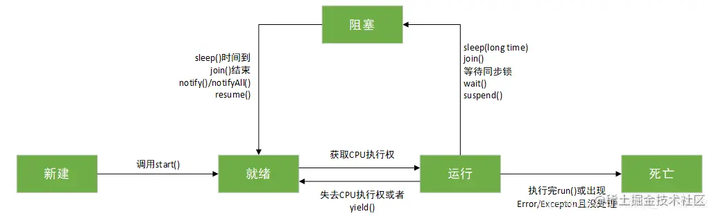 - join():在线程a中调用线程b的join()方法,此时线程a就进入阻塞状态,直到线程b完全执行完以后,线程a才结束阻塞状态。