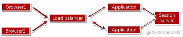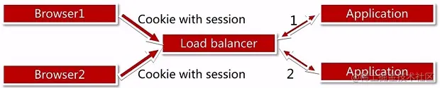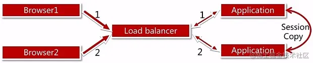 session 复制,即当 browser1 经过负载均衡服务器把 session 存到 application1 中,会同时把 session 复制到 application2 中,所以多台服务器都保存着相同的 session 信息。