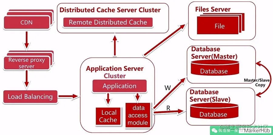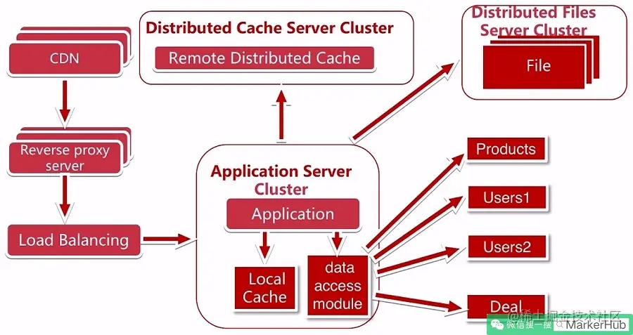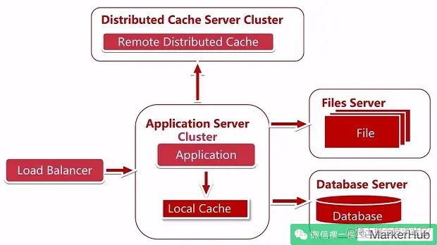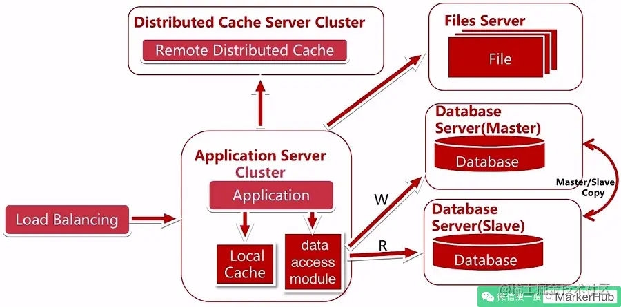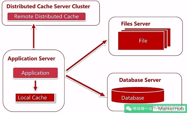 我们发现有很多业务数据不需要每次都从数据库中获取,于是我们使用了缓存,因为 80% 的业务访问都集中在 20% 的数据上 (二八原则),如果能将这部分数据缓存下来,性能就能提高很多,缓存又分两种,一种是 Application 中的本地缓存,还有远程缓存,远程缓存又分为远程的单机式缓存和分布式缓存 (图所示的是分布式缓存集群)。