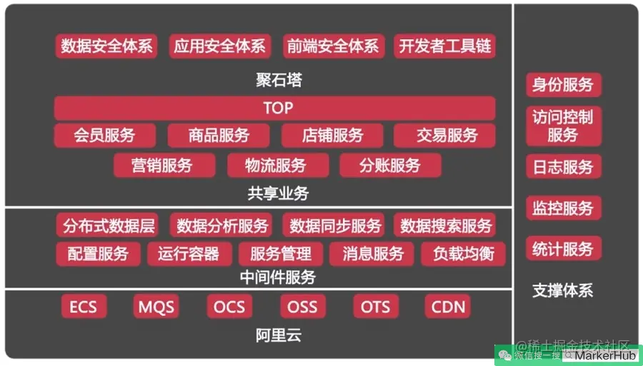 最上面的就是安全体系系统,中间的就是业务运营系统,包含各个不同的业务服务,下面是一些共享服务,然后还有一些中间件,其中 ECS 就是云服务器,MQS 是队列服务,OCS 是缓存等等,右侧是一些支撑体系服务。