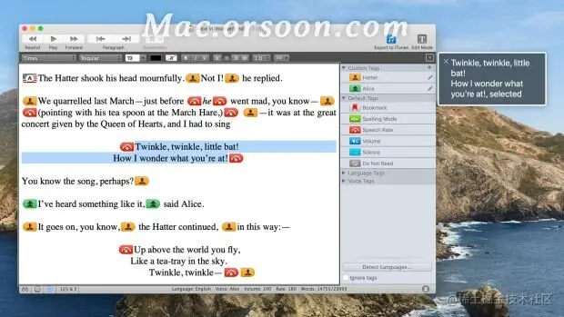 这款 App 支持 macOS 的「旁白」和「切换控制 」功能,还能把文本导出为音频文件,在 iPhone 或 Apple Watch 上的《音乐》中播放。