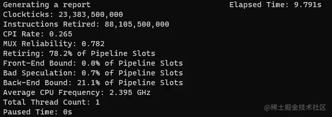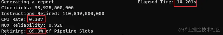 耗时从原来的15s 降低到现在9.8s,性能提升34%:retiring 从66.9% 提升到78.2% ;Back-End bound 从31.4%降低到21.1%