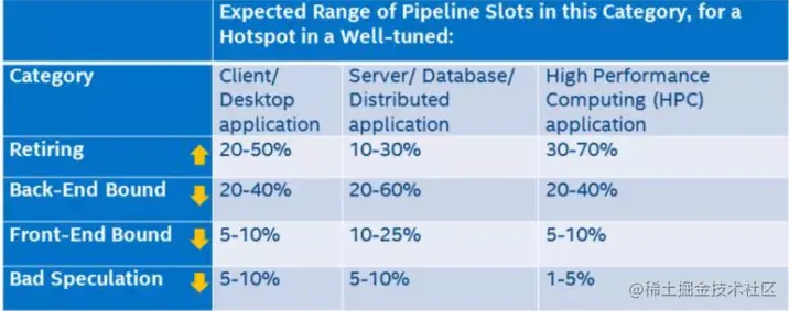 上图中的叶子节点,程序运行一定时间之后各个类别都会有一个pipeline slot 的占比,只有Retiring 的才是我们所期望的结果,那么每个类别占比应该是多少才是合理或者说性能相对来说是比较好,没有必要再继续优化?intel 在实验室里根据不同的程序类型提供了一个参考的标准: