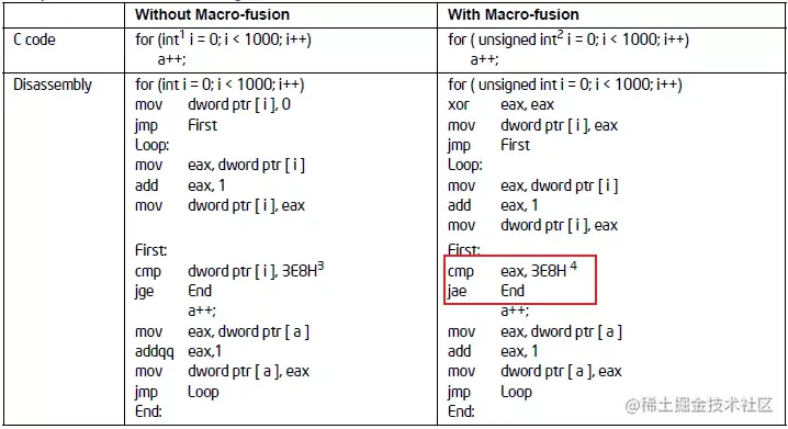 宏融合特性可以将2条指令合并成一条微指令,它能提升Front-End的吞吐。 示例:像我们通常用到的循环: