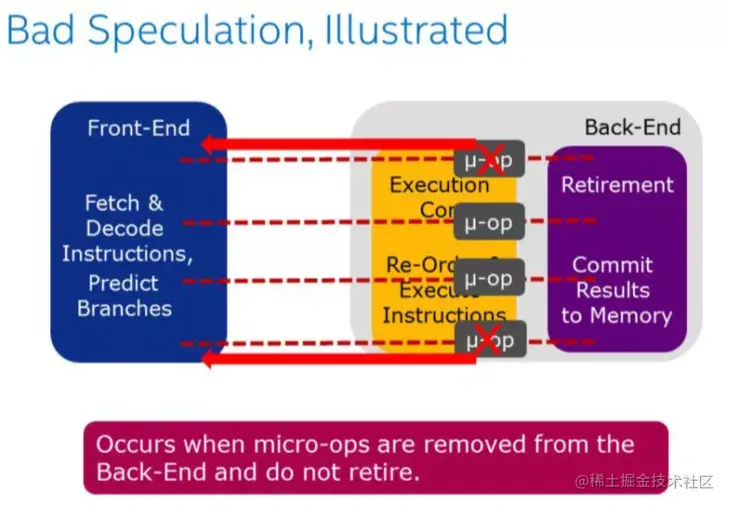 Bad Speculation表示错误预测导致浪费pipeline 资源,包括由于提交最终不会retired的 uOps 以及部分slots是由于从先前的错误预测中恢复而被阻塞的。由于预测错误分支而浪费的工作被归类为"错误预测"类别。例如:if、switch、while、for等都可能会产生bad speculation。