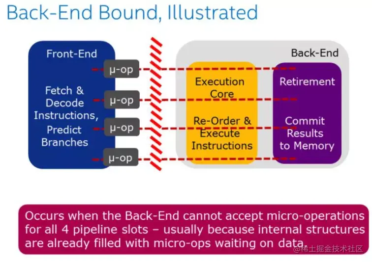 Back-End 处理器的核心部分是通过调度器乱序地将准备好的uOps分发给对应执行单元,一旦执行完成,uOps将会根据程序的顺序返回对应的结果。例如:像cache-misses 引起的阻塞(停顿)或者因为除法运算器过载引起的停顿都可以归为此类。此类别可以在进行细分为两大类:Memory-Bound 、Core Bound。