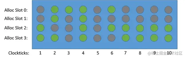 TMAM 评估各个指标过程中采用两种度量方式一种是cpu时钟周期(cycle[6]),另外一种是CPU pipeline slot[4]。该方法中假定每个CPU 内核每个周期pipeline都是4个slot即CPU流水线宽是4。下图展示了各个时钟周期四个slot的不同状态,注意只有Clockticks 4 ,cycle 利用率才是100%,其他的都是cycle stall(停顿、气泡)。