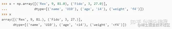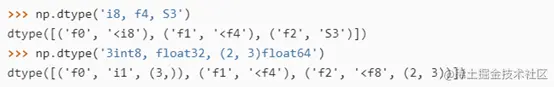每个元组都有其形式(字段名、数据类型、形状),其中形状是可选的。fieldname是一个字符串,datatype可以是任何可转换为数据类型的对象,shape是指定子数组形状的整数元组。