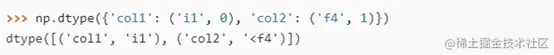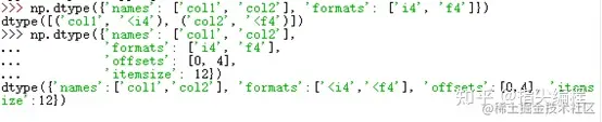 这种形式的规范,不建议使用,这里说明,是因为较早的numpy代码可能会使用它。字典的键是字段名称,值是指定类型和偏移量的元组: