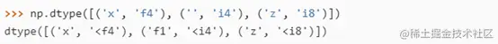 在这种简写形式中,可以在字符串中使用任何字符串dtype规范,并用逗号分隔,字段的itemsize和字节偏移量自动确定和字段名默认名称为f0、f1等等。
