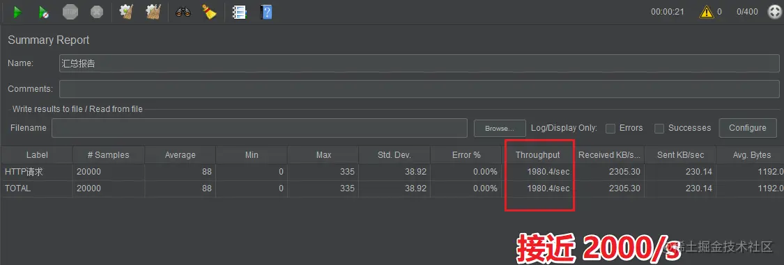 可以看下执行结果,吞吐量在 2422 个每秒,还是比较高的。