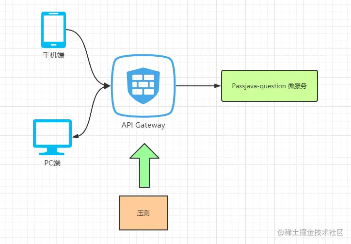 客户端分为手机端和 PC 端,http 请求先经过 API Gateway,然后再转发到 question 微服务。其中涉及到了中间件:Gateway 网关。