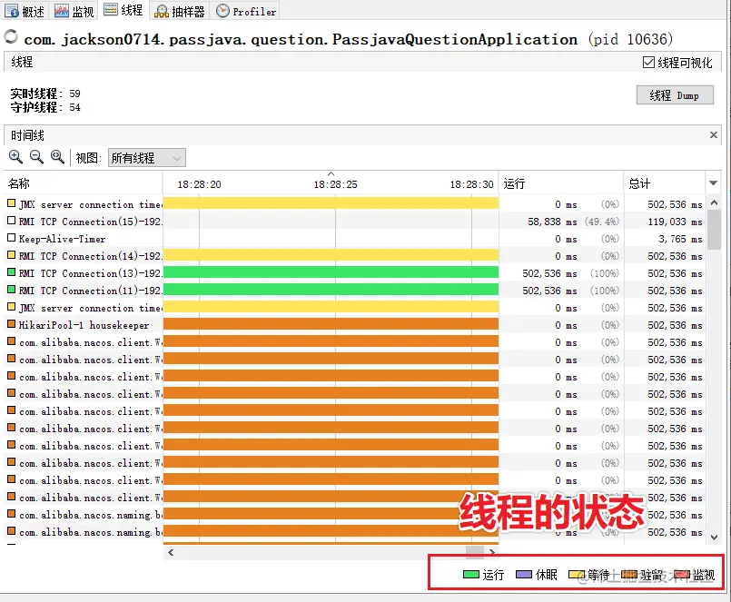 下面是线程的使用情况,可以看到线程峰值和活动线程的总数量,目前看到的峰值是59,活动线程数是 57。下半部分可以看到具体是哪些线程,以及线程的堆栈信息,非常详细。