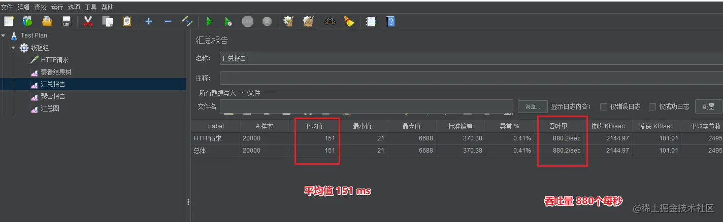 200 个线程,每个线程调用 100 次,总共 2 w 次,可以看到下图中表格中的样本列也是 2 w,请求所耗费的时间是 151 ms,吞吐量是 880 个请求每秒。