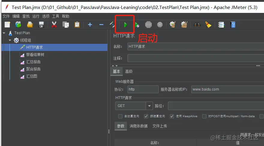 点击播放按钮就开始启动了。注意启动之前需要先设置线程组的参数配置和 HTTP 请求的配置。