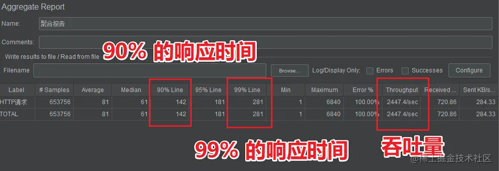 异常 0.41% 说明 2 w 个请求中有 82 个请求异常(20000 * 0.0041 = 82 )。