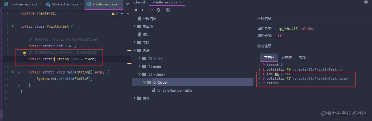 仔细观察上面的代码,会发现,final的属性,即使是static修饰的,在<clinit>()里面都不会存在,这是为什么呢?