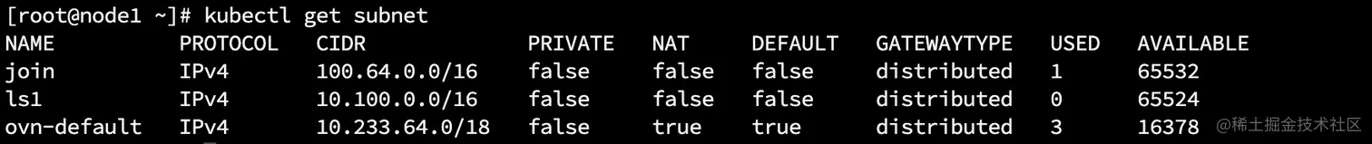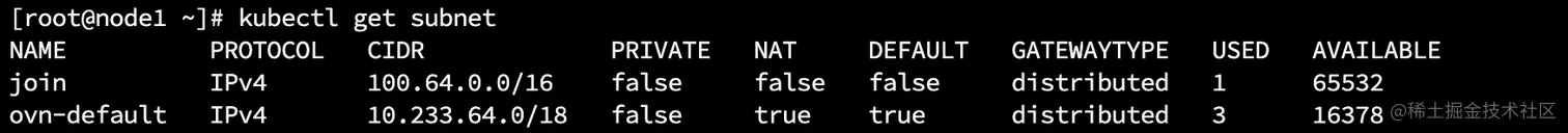 查看当前的子网kubectl get subnet,能看到 join 子网与 ovn-default 子网: