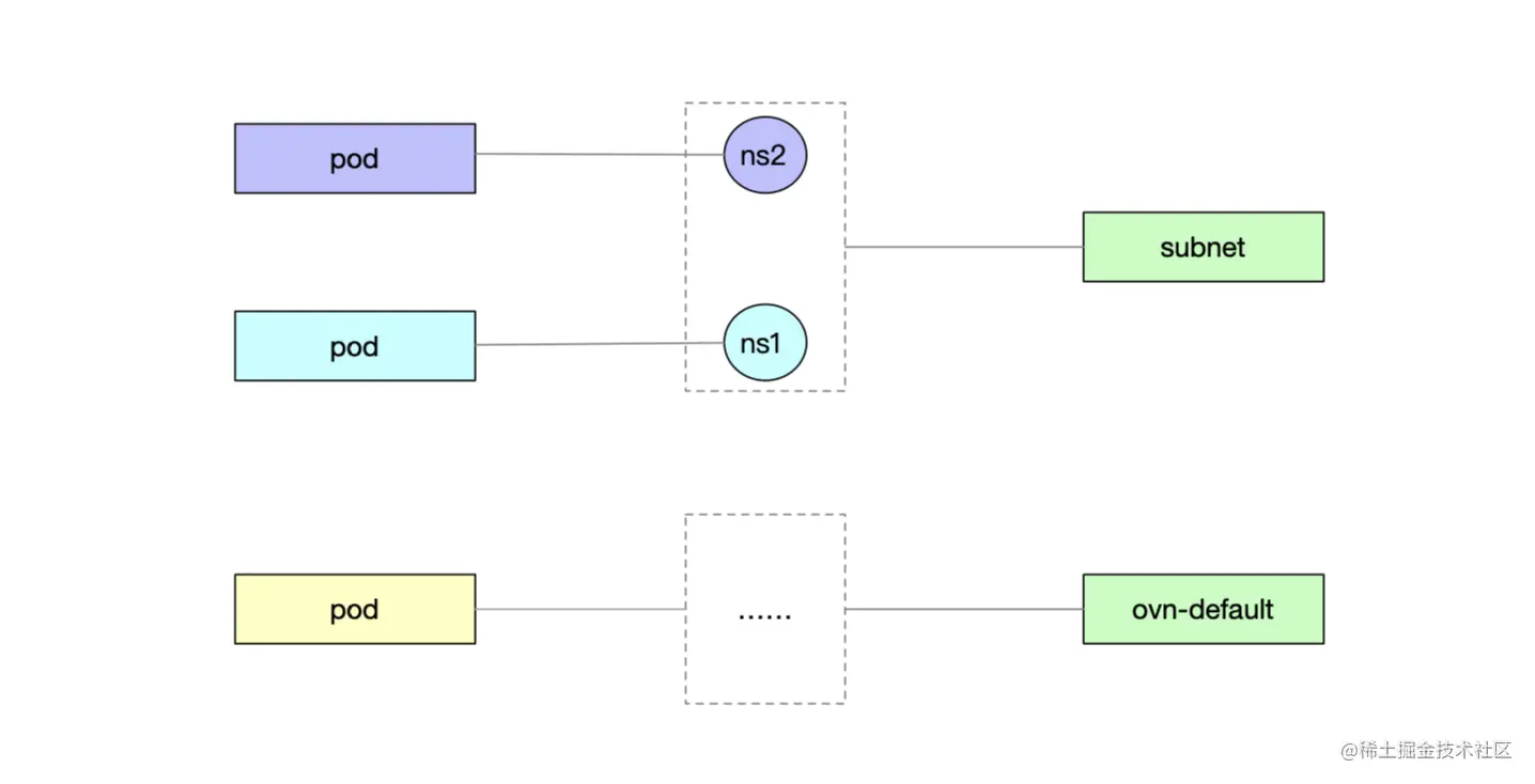 在 Kube-OVN 中通过子网组织 IP,一个或多个 Namespace 可以被绑定到一个子网中,这些 Namespace 下的 Pod 将会从该子网中分配 IP,并使用子网下的网络配置。如果 Pod 绑定的 Namespace 没有绑定子网,将使用默认子网 ovn-default 为其分配 IP 地址。 在 github.com/alauda/kube… 上有关于 Kube-OVN 详细的使用教程,可移步 Kube-OVN 社区查看。